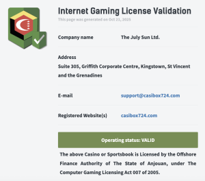 Casibox, Anjouan Gaming lisansıyla faaliyet gösteren bir çevrimiçi oyun platformudur. Lisans, platformun yasal çerçevede hizmet sunmasını ve düzenli denetimlerle şeffaflığını sağlar. Spor bahisleri, casino ve canlı oyunlar gibi tüm kategoriler lisans kapsamındadır ve güvenli bir oyun ortamının oluşturulmasına katkı sunar.